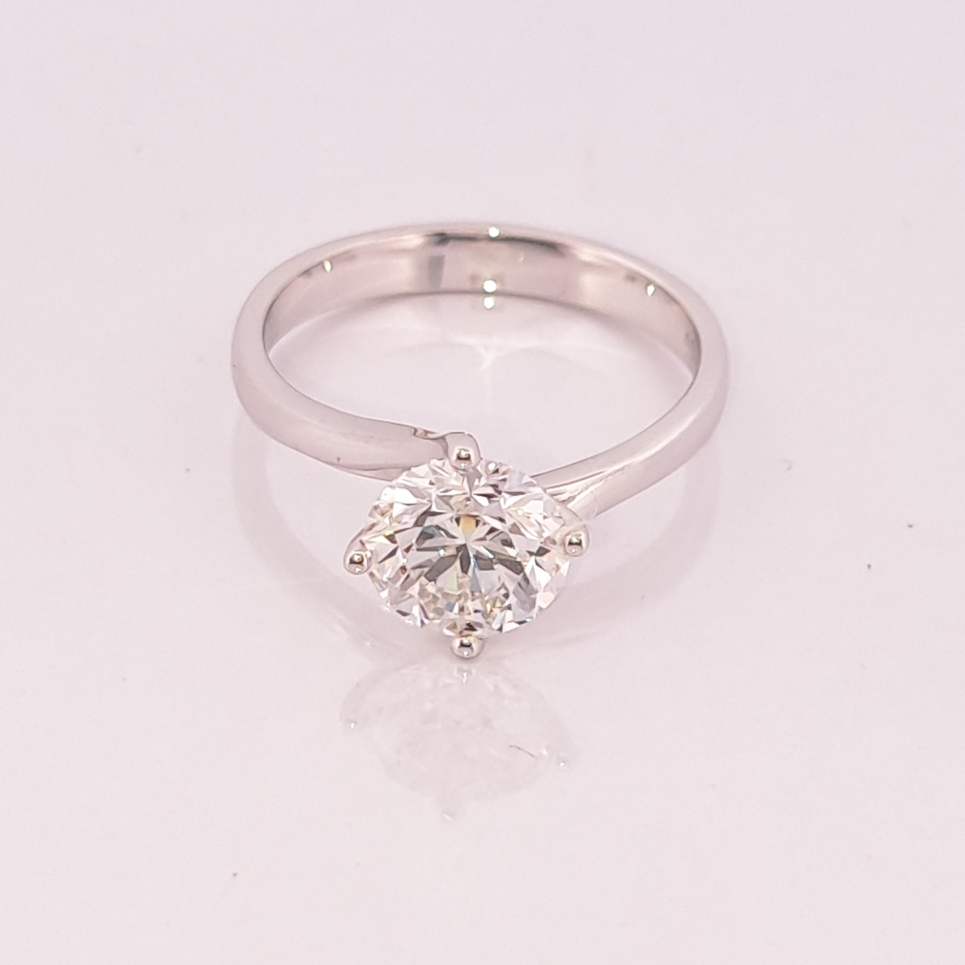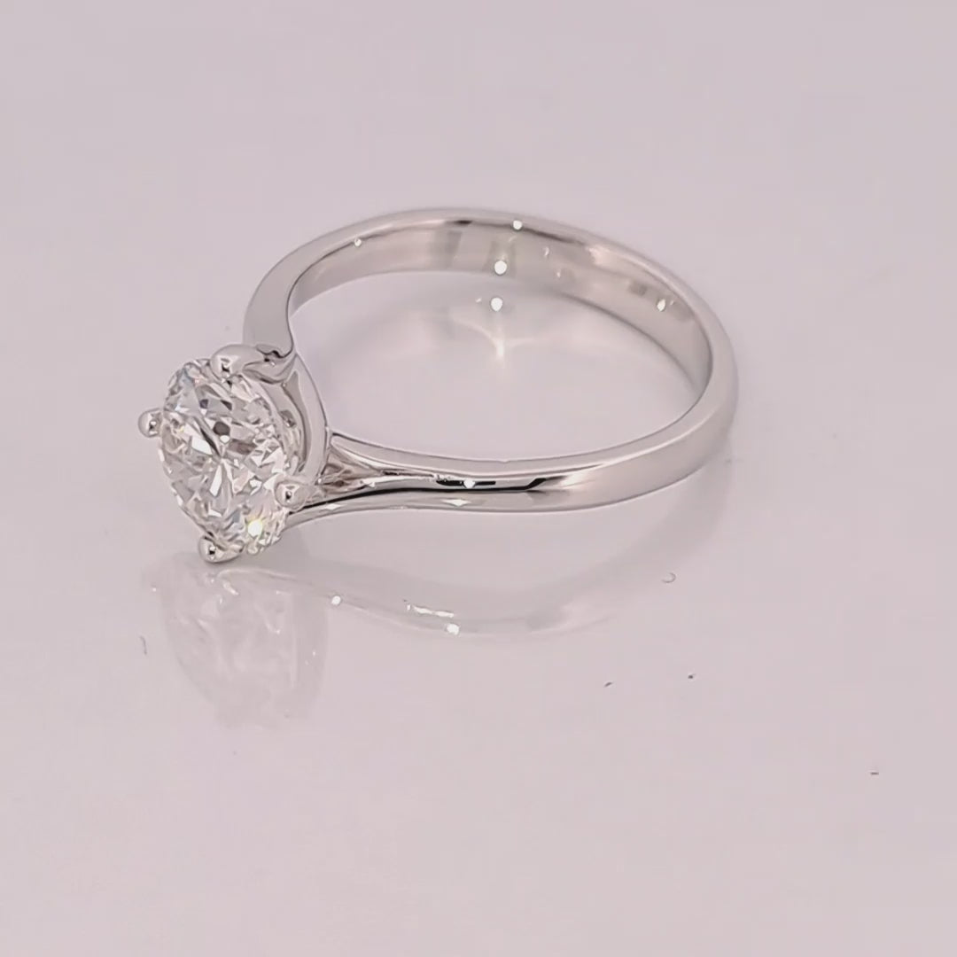 Exquisite lab-grown diamond solitaire ring is set in lustrous white gold, showcasing a brilliant round-cut diamond at its center. The diamond, carefully selected for its exceptional clarity and sparkle, is securely held in place by a unique twisted prong design. The prongs elegantly intertwine, creating a delicate and modern look that enhances the diamond's natural beauty. The sleek, polished band complements the setting, providing a sophisticated and timeless appeal. This ring is a perfect blend of contemporary style and classic elegance, making it an ideal choice for those who appreciate the beauty of lab-grown diamonds and seek a distinctive piece of jewelry.