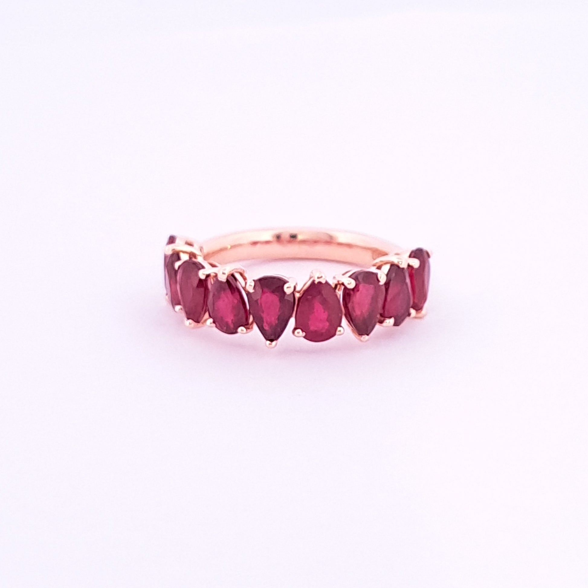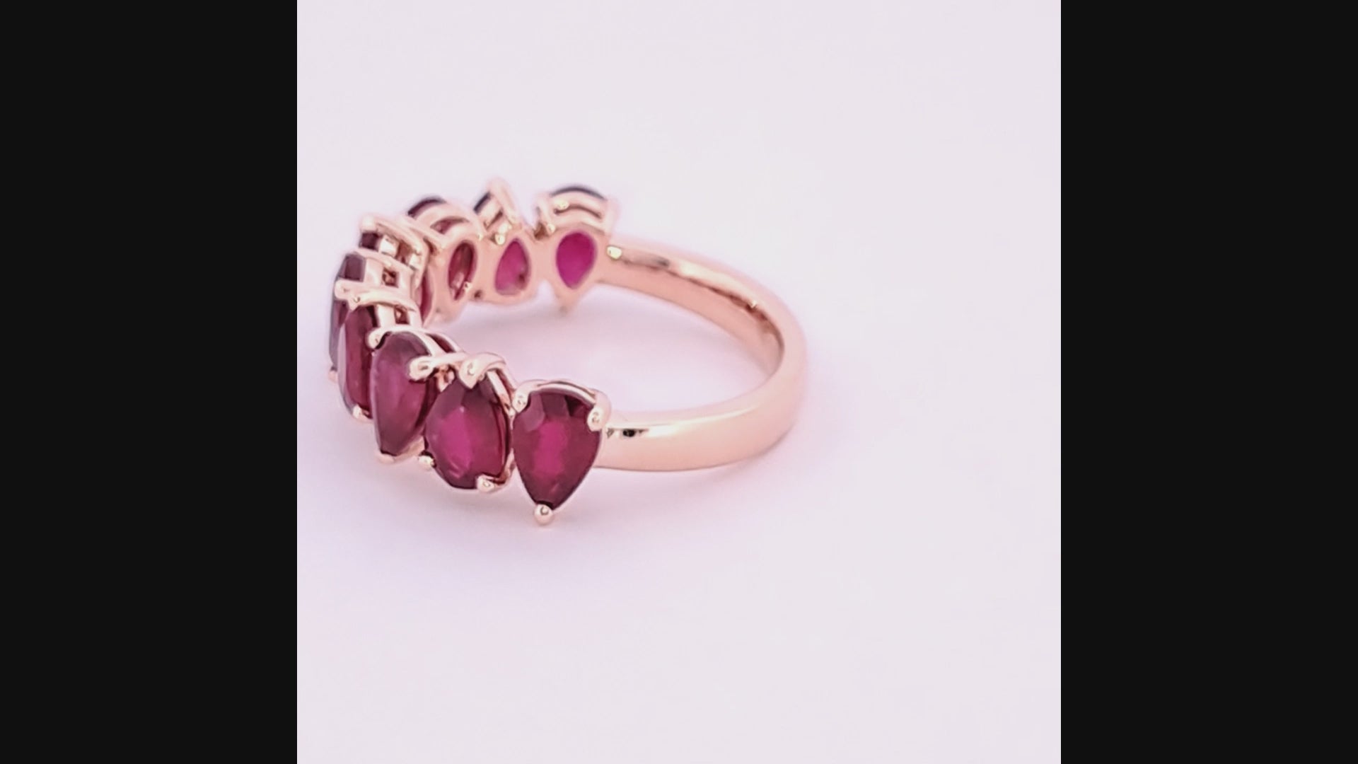 Exquisite rose gold ring, adorned with 9 stunning pear-shaped rubies set in an elegant alternating pattern. Elevate your style with this unique piece.